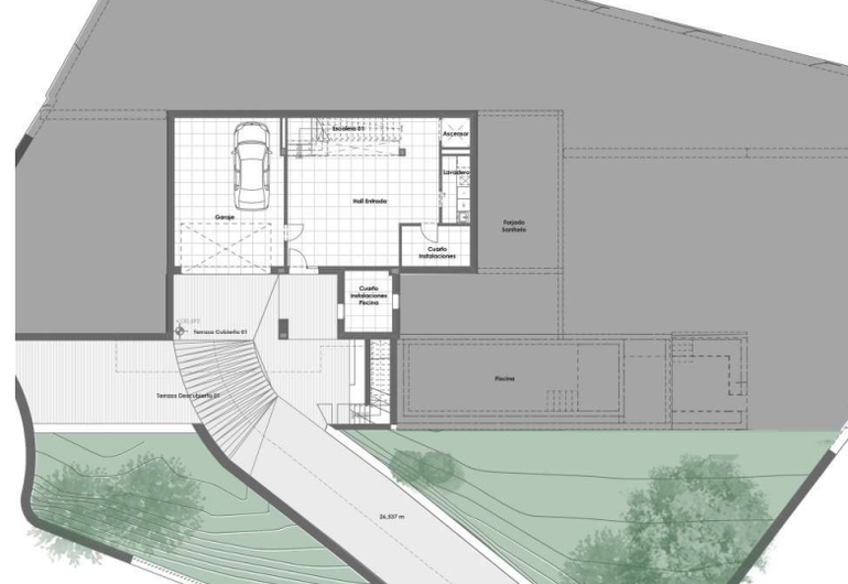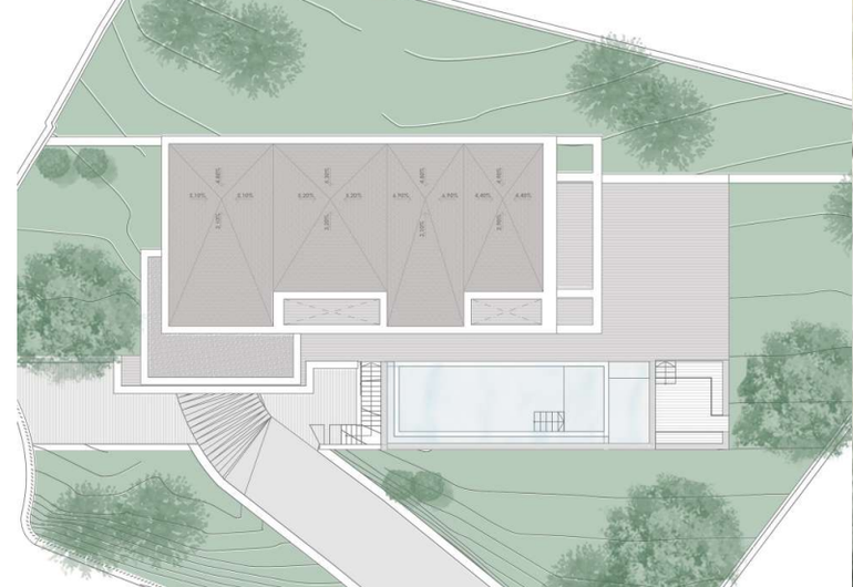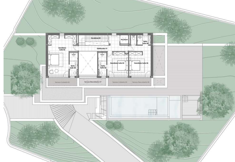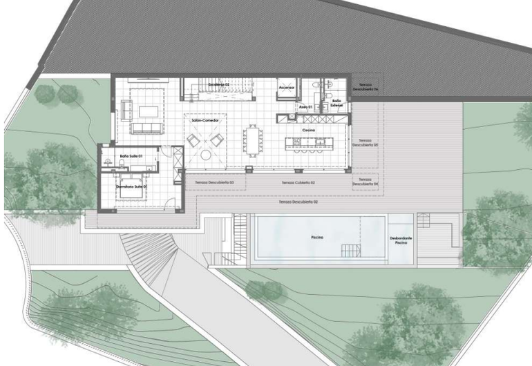 Die Villa hat eine bebaute Gesamtfläche von 425 m2, verteilt auf drei Etagen und ist mit einem Aufzug für maximalen Komfort ausgestattet. Im Erdgeschoss befinden sich ein geräumiges Wohnzimmer mit Essbereich, eine Lounge und eine voll ausgestattete offene Küche mit Kücheninsel. Außerdem gibt es auf dieser Etage ein sehr geräumiges Schlafzimmer mit Doppelbett und einem eigenen Bad sowie ein Gäste-WC. Sowohl vom Schlafzimmer als auch vom Wohnzimmer aus hat man durch Schiebefenster direkten Zugang zur Terrasse am Pool. Das Obergeschoss besteht aus drei Doppelschlafzimmern, jedes mit eigenem Bad und mit Zugang zu einer überdachten Terrasse. Im Untergeschoss befinden sich eine Garage mit Platz für zwei Autos, eine Waschküche, zwei Technikräume und ein Mehrzweckraum. Die Villa hat sowohl eine Sonnenterrasse als auch eine überdachte Terrasse am Pool und wird von einem schönen mediterranen Garten mit automatischer Bewässerung umgeben sein. Der Pool ist mit einer Beleuchtung ausgestattet und es gibt ein Außenbad.